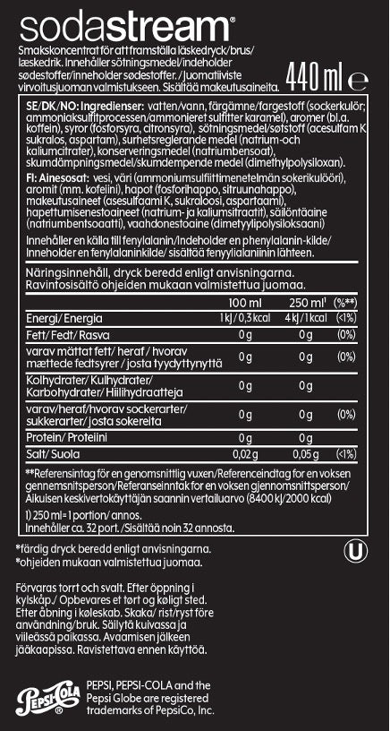 Ingredienser: Vand, farvestof (ammoniak sulfiteret karamel), syre (phosphorsyre, citronsyre), surhedsregulerende midler (natriumcitrater, kaliumcitrat), sødestoffer (acesulfam K, sukralose, aspartam), smagsstoffer (inklusive koffein), konserveringsmidler (natriumbenzoat), antiskumningsmiddel (dimethylpolysiloxan).