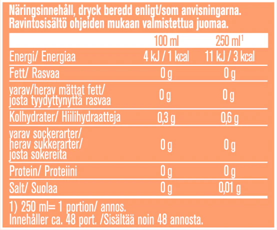 Instruktioner: Tilsæt ca. 3/4 teskefuld til en 1 L SodaStream flaske med kulsyreholdigt vand. Tilpas efter smag. Opbevares i køleskabet i højst 4 uger efter åbning. Tilføj altid kulsyre, inden du tilsætter smag. Sip, sip, hurra!