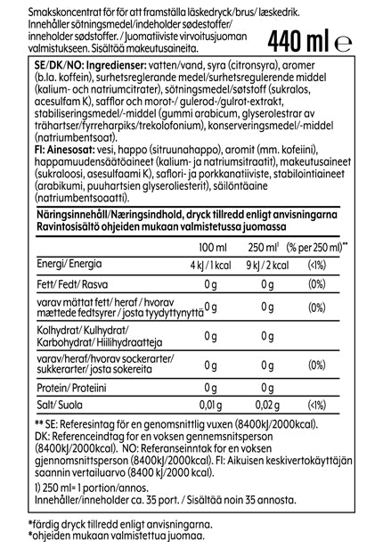 Ingredienser: Vand, syre (citronsyre), stabilisatorer (natriumoctenylsuccinatstivelse, glycerolestere af træharpikser), surhedsregulerende midler (natriumcitrater, kaliumcitrater), sødestoffer (skcralose, acesulfam K), smagsstoffer, konserveringsmidler (natriumbenzoat), farvestof (beta-caroten), antioxidant (ascorbinsyre).