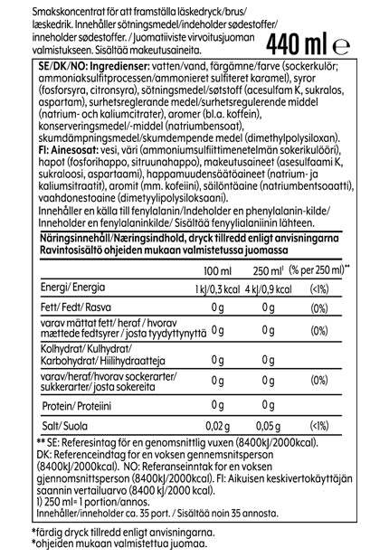Smagskoncentrat til fremstilling af en kulsyreholdig sukkerfri drik med colasmag. Giver op til 8 L færdig drik.