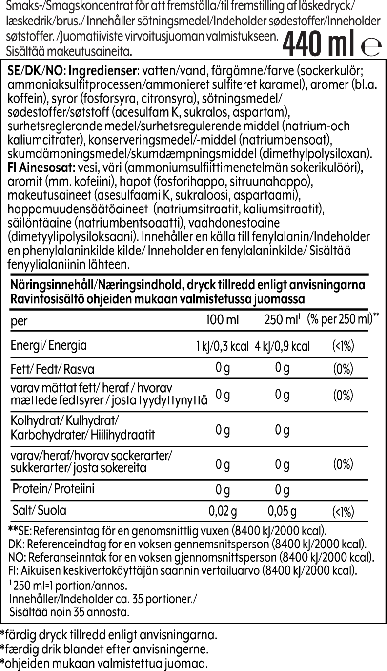 Ingredienser: vand, farvestof (sukker farve; ammonieret sulfiteret karamel), aromer (koffein), syror (phosphorsyre, citronsyre), sødestoffer (acesulfam K, sukralos, aspartam), surhetsregulerende middel (natrium-og kaliumcitrater), konserverings middel (natriumbensoat), skumdæmpningsmiddel (dimethylpolysiloxan).